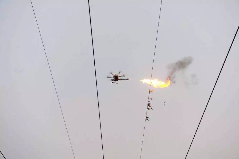 他們采用工業(yè)用無人機,下面加裝了特制的噴火裝置。相對于人工除障,無人機噴火除障不但消除了高溫天氣下人工除障的不安全因素,而且不需要停電,大大提高了作業(yè)效率。
